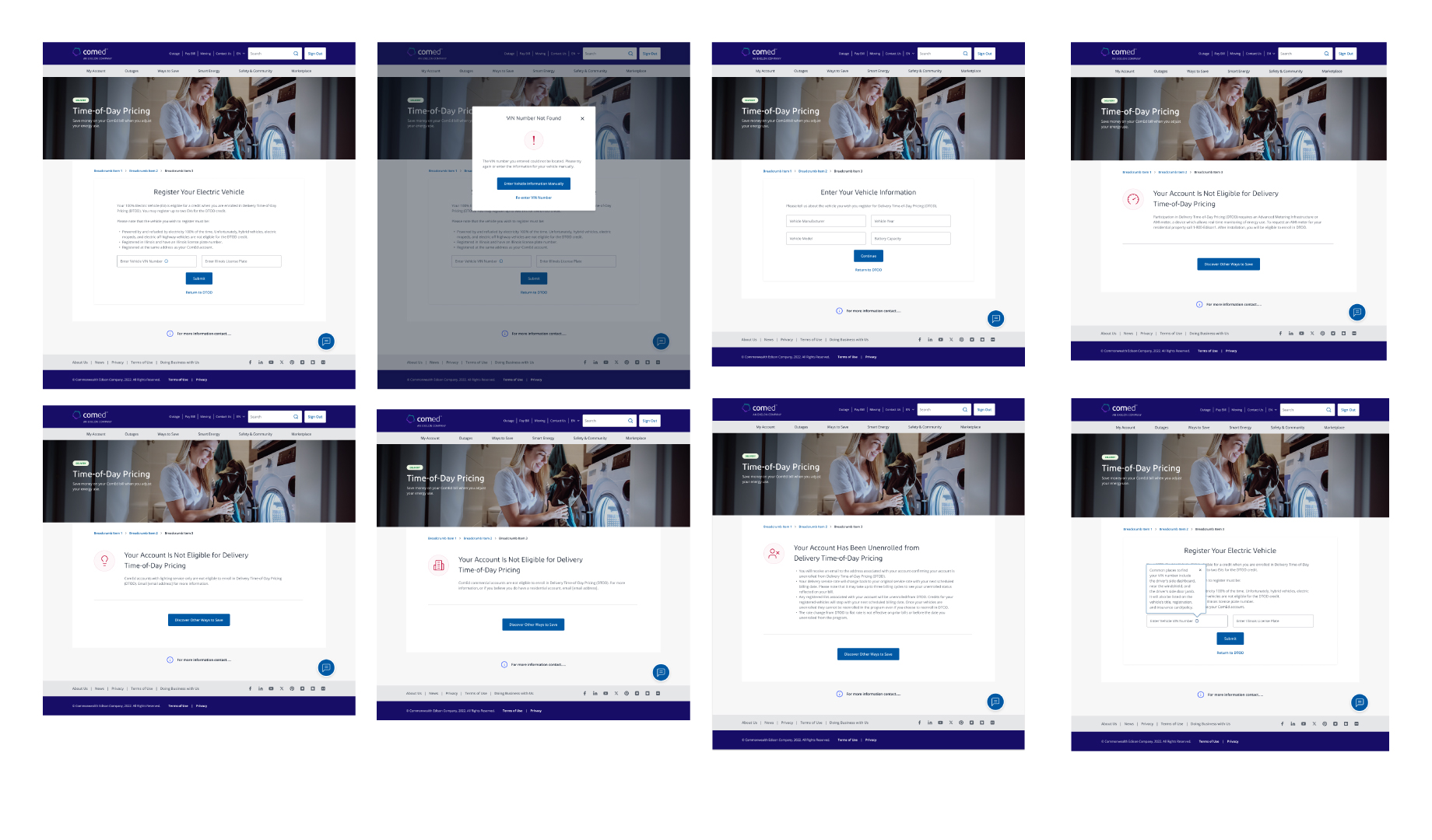 As part of a statewide energy initiative, I led the UX design for ComEd’s new Residential Delivery Time of Day (DTOD) Rate and EV Credit enrollment experience. Mandated by the Illinois Commerce Commission, this project empowers residential customers—especially electric vehicle (EV) owners—to save money by shifting energy usage to off-peak hours. I collaborated cross-functionally to design and validate user flows that support eligibility checks, EV VIN validation, dynamic messaging, enrollment, and account management. The digital experience spans rate education, intuitive enrollment forms, system constraints, and confirmation emails—delivering a seamless, accessible user experience across ComEd’s digital platform.