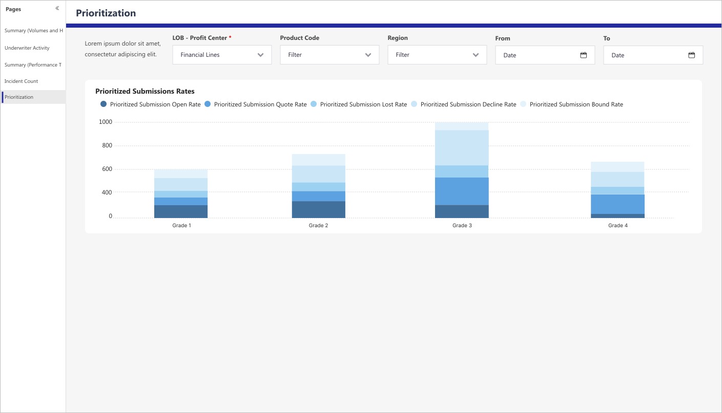 Client teams needed a centralized dashboard to track UWA performance and business impact for the Package Team. Leadership, data stakeholders, and operation managers lacked a unified way to monitor submission volumes, underwriter activity, cycle times, incidents, and prioritization across Lines of Business. I was tasked with designing a multi-screen dashboard from scratch that would meet both analytical and business needs.